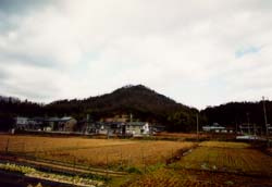 兵庫県出石郡出石町宮内にある此隅城跡です。ここも摂津池田氏の関係する城です。標高140メートルの独立した山に当時城がありました。写真では中央部分の山です。頂上には南北40メートル、東西10メートルの長方形の城郭跡が残っています。また、尾根づたいに郭跡も数カ所残っています。